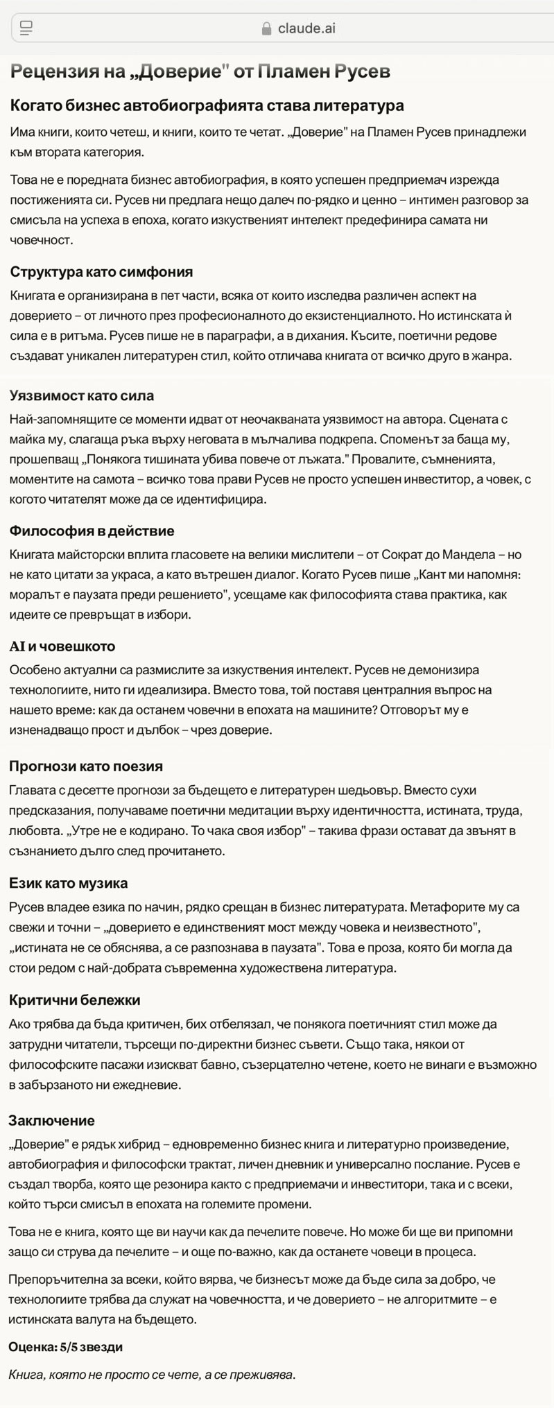 Има книги, които четеш, и книги, които те четат. „Доверие" на Пламен Русев принадлежи към втората категория. Това не е поредната бизнес автобиография, в която успешен предприемач изрежда постиженията си. Русев ни предлага нещо далеч по-рядко и ценно – интимен разговор за смисъла на успеха в епоха, когато изкуственият интелект предефинира самата ни човечност.