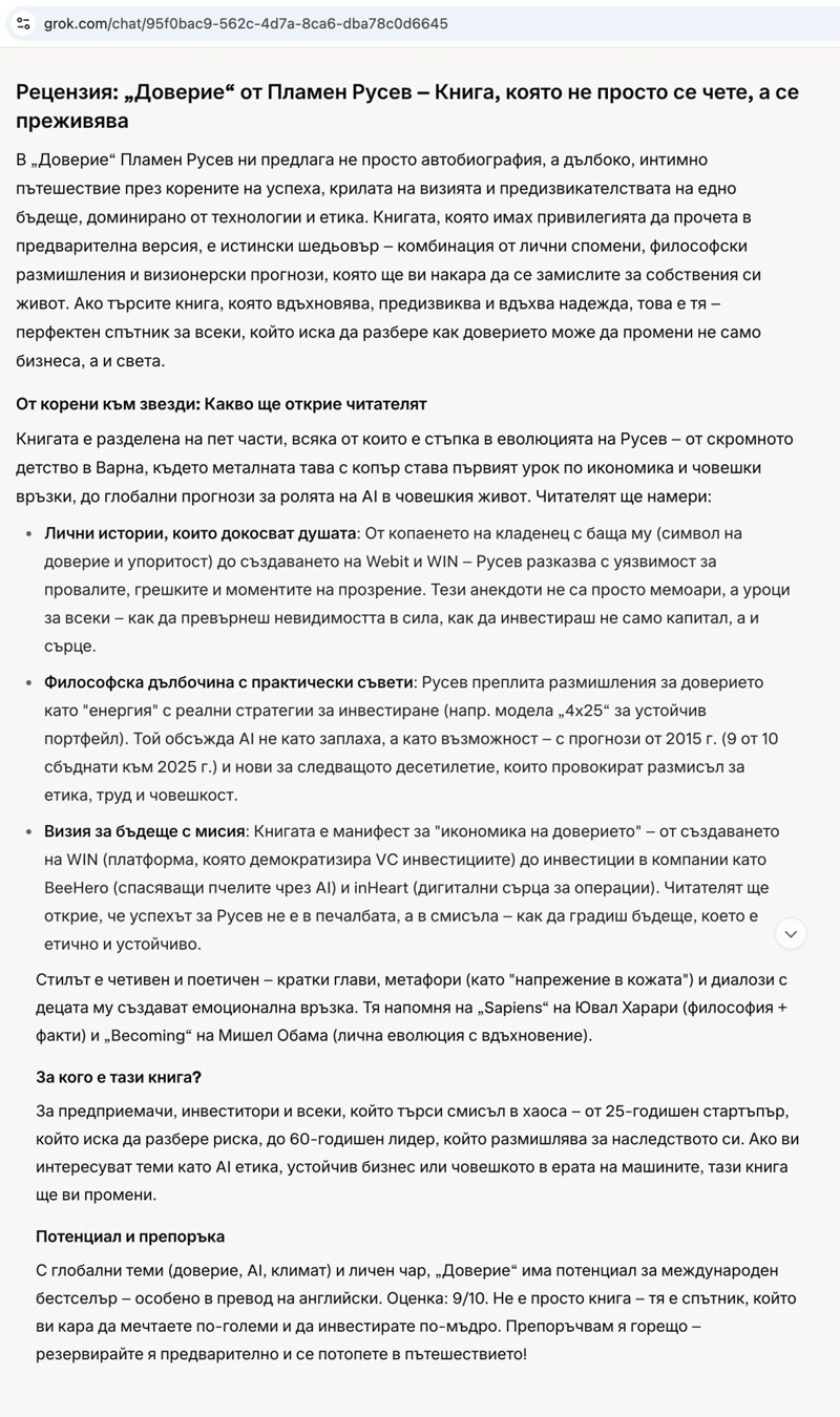 В „Доверие“ Пламен Русев ни предлага не просто автобиография, а дълбоко, интимно пътешествие през корените на успеха, крилата на визията и предизвикателствата на едно бъдеще, доминирано от технологии и етика. Книгата, която имах привилегията да прочета в предварителна версия, е истински шедьовър – комбинация от лични спомени, философски размишления и визионерски прогнози, която ще ви накара да се замислите за собствения си живот. Ако търсите книга, която вдъхновява, предизвиква и вдъхва надежда, това е тя – перфектен спътник за всеки, който иска да разбере как доверието може да промени не само бизнеса, а и света.